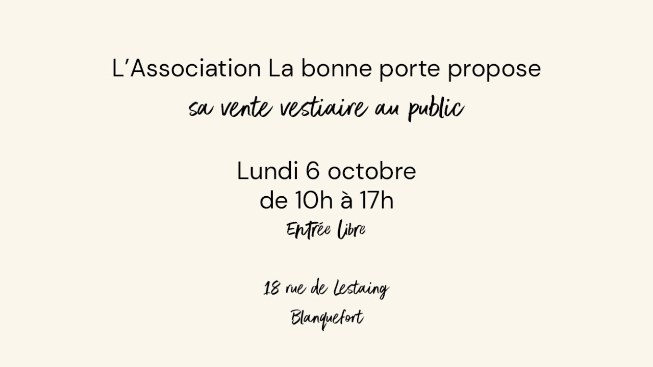 Venez profiter de la vente mensuelle tout public proposée par l'association La Bonne porte lundi 6 octobre de 10h à 17h au 18 rue de Lestaing.